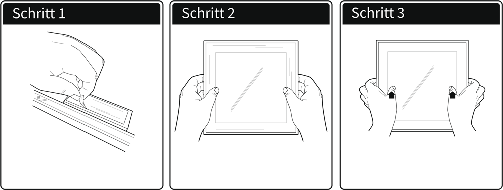 Auf der Rückseite sind zwei Klebestreifen. Du ziehst die Schutzfolien ab und drückst die Bilderrahmen einfach an die Wand.
